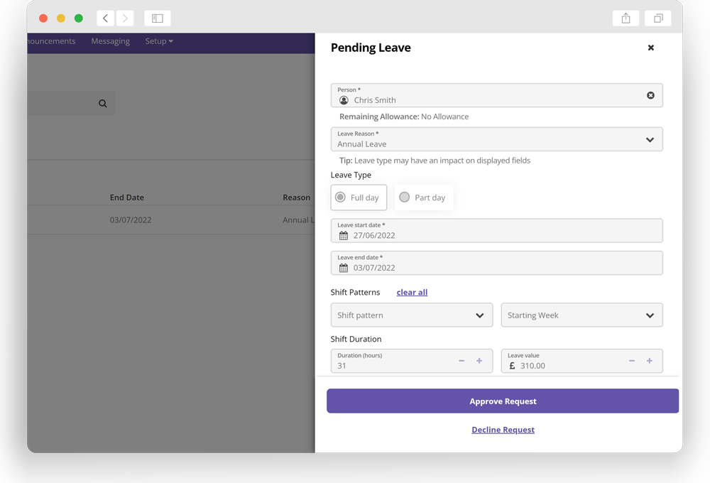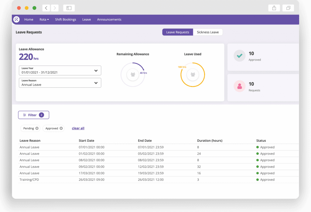 Rotify gives your staff ownership of their own leave. They can request annual leave – and anything else you allow, such as training days or parental leave – and see everything that’s going on with our clever leave dashboard.